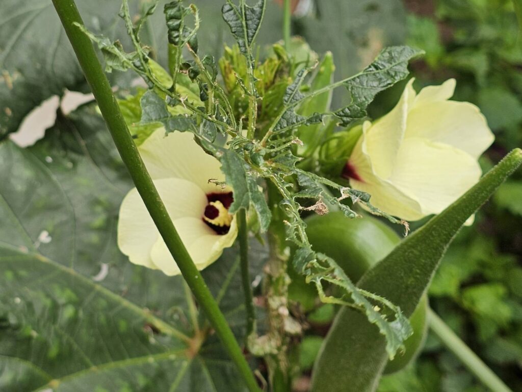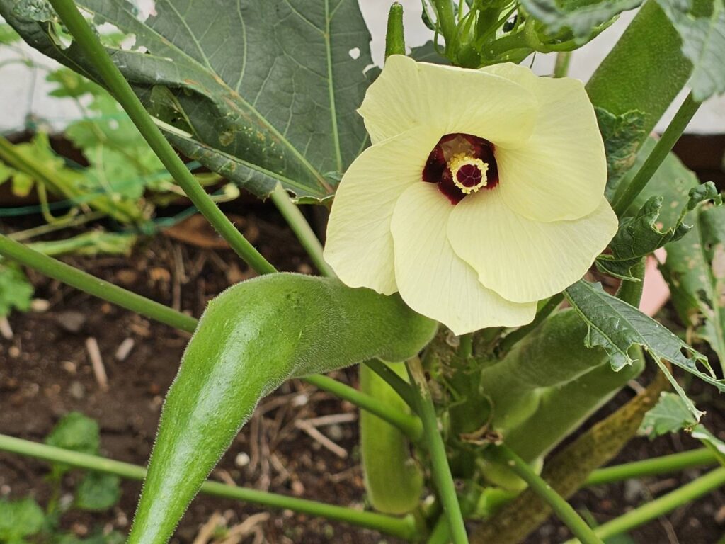 ↓オクラが特大に実り、花も満開です。長いものは20センチほどに実っていて、それは種にするそうです。先月5本いただきましたが、外側も角がなくて柔らかく、5種類くらい?ある品種によって柔らかさに違いがあるようです。