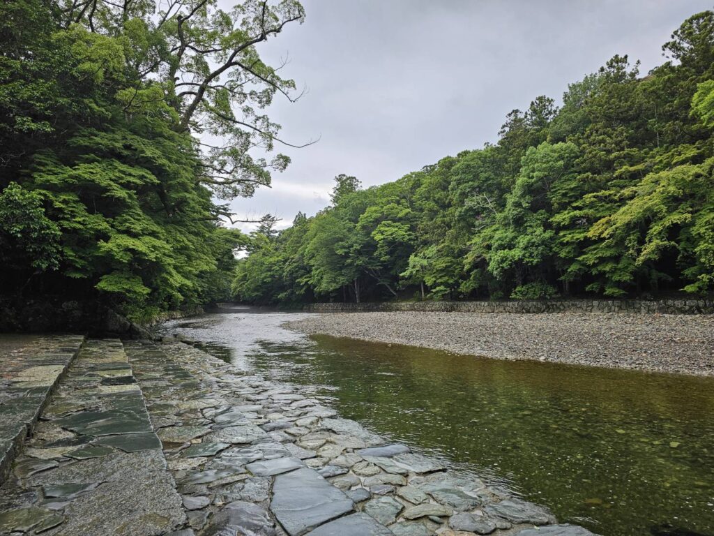 まずは五十鈴川を見て毎回水を触らせて頂くのが恒例になっていますが、この日は水量が少なかったため、指先だけ触らせてもらいました。